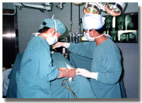 | 歯周病科では歯の周りの骨や歯肉の治療を行います。治療に先立って、歯肉の検査をおこないます。これは痛くありません。200箇所近い場所の歯肉を調べ、その結果から患者さんの治療計画を立てます。多くの場合、歯肉の悪い個所をいろいろな手術や薬を使って健康な状態に戻していきます。一般の歯科治療と違うところは、患者さんにも口の中が管理できるようになってもらわないと成功しません。我々と患者さんと一緒にがんばらないとうまく治療が進みません。しかし、心配はいりません患者さん一人一人に当センターの専門スタッフがついて指導します。多くの患者さんが、当センターの歯周病科で治療を完了されています。 |