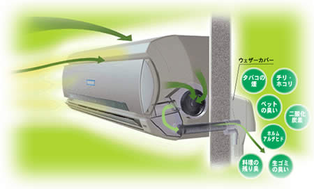 | エアコン内部に排気ファンを設けました。お部屋の中の空気を強制的に室外に排出し、空気のこもりを抑えます。 |
