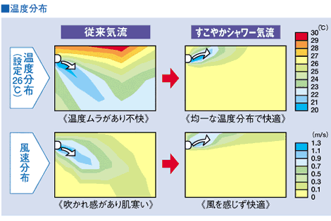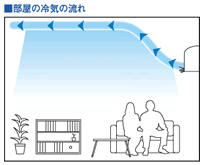 “風は面に沿って進む”という「コアンダ効果」の原理を応用。風が天井方向に流れ、体には直接風が当たらず、涼しさだけを感じます。だから冷房が苦手な女性や赤ちゃん、就寝時にもおすすめです。 |