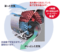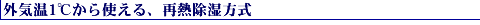 | 従来の除湿は、空気を冷やして除湿していたので、吹き出す風が冷たくなっていました。再熱除湿は、湿気を取った空気を再熱器で暖めてから送るので肌寒さを抑えます。また、外気温1℃から除湿できるので、冬場の結露予防にも使えます。 |