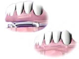 下顎にインプラントを使用する方法の一つはバーでインプラントをつなぎ、クリップを新しい義歯に付けます。これらのクリップにより義歯を固定し、ぐらつきを抑えることができます。この装置は着脱可能なので、家庭できれいに清掃することができます。もう一つの選択肢はブリッジです。これはインプラント部に合着し保持します。
